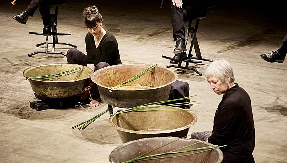 Des sonneurs de bassins. Erwan Keravec s’est nourri de cette tradition populaire pour composer une pièce musicale aux accents contemporains. Des bourdons, du jonc, rien de miraculeux ou de spectaculaire. Mais le moindre mouvement des musiciennes et musiciens revêt une importance folle, et se traduit à l’oreille. Le spectacle sonne ainsi : sous couvert d’une apparente simplicité, se produit un assemblage inouï.